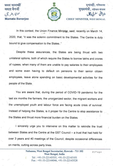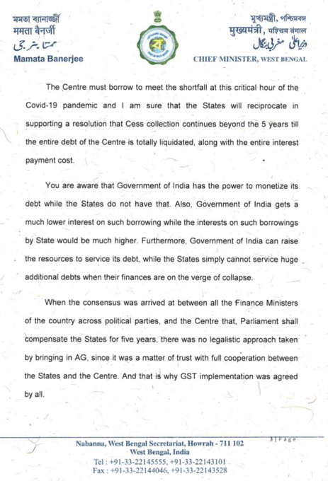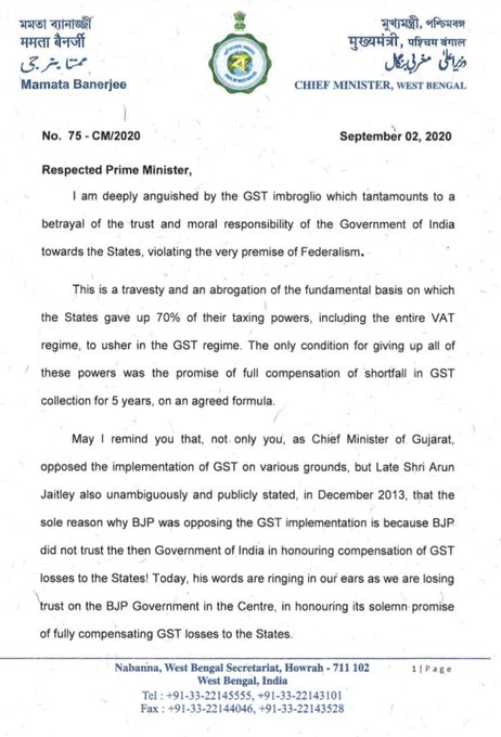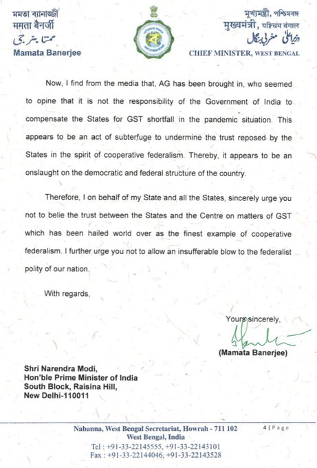Chief Minister, Mamata Banerjee writes a letter to Prime Minister, Narendra Modi, urging the Centre to clear #GST dues to States.